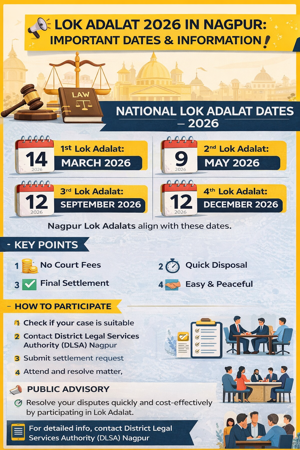 📢 Lok Adalat 2026 in Nagpur: Important Dates & Public Information Lok Adalat is an effective and people-friendly judicial mechanism aimed at speedy, amicable, and