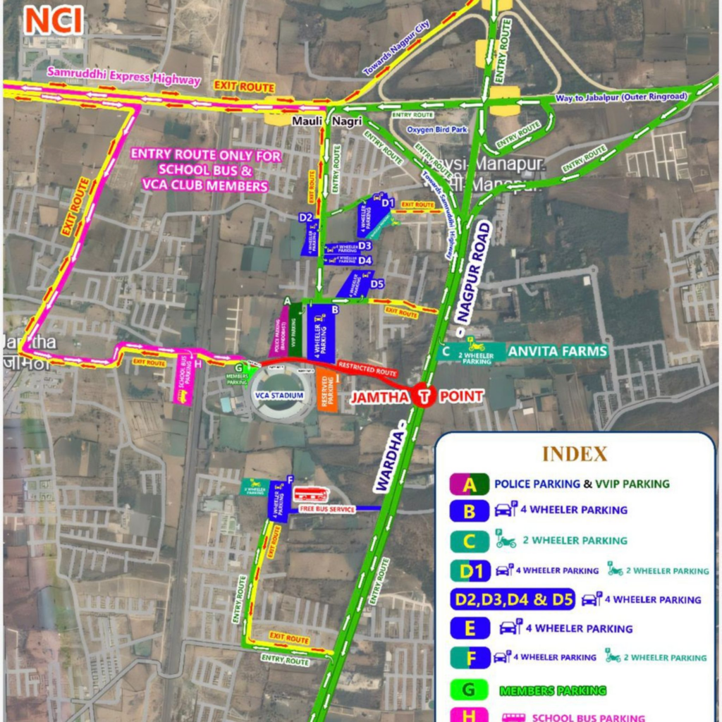 उपायुक्त पोलीस (वाहतूक) लोहित मातानी यांनी सांगितले की, सामन्याच्या वेळेत वर्धा रोडवर मोठ्या प्रमाणात वाहतूक वाढण्याची शक्यता आहे. ही परिस्थिती सुरळीत हाताळण्यासाठी स्टेडियमकडे ये जा करण्यासाठी स्वतंत्र प्रवेश व निर्गमन मार्ग निश्चित करण्यात आले आहेत. तसेच दुचाकी, चारचाकी, शालेय बस, व्हीआयपी, व्हीसीए सदस्य, पोलीस कर्मचारी व माध्यम प्रतिनिधींसाठी स्वतंत्र पार्किंग व्यवस्था करण्यात आली आहे.