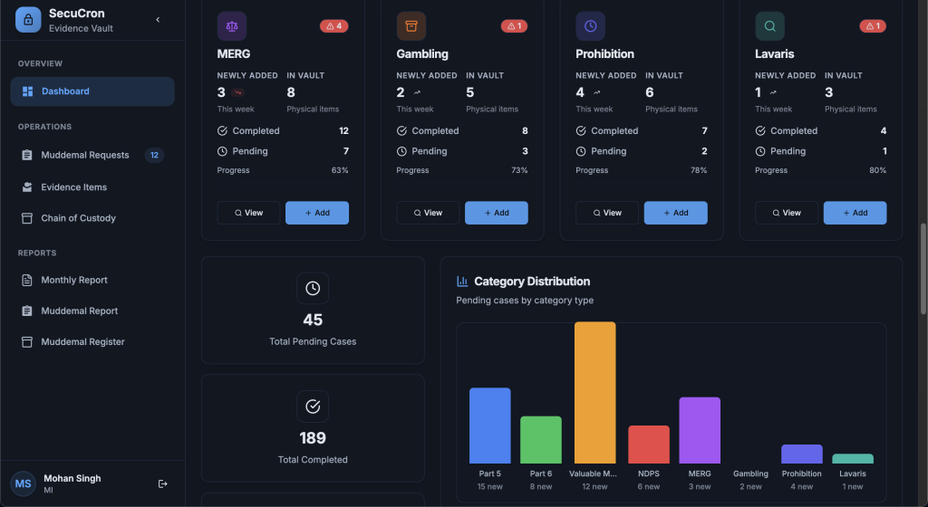सर्व पुरावे-संबंधित माहिती नोंदविण्यासाठी एक केंद्रीकृत डिजिटल प्लॅटफॉर्म. हे सॉफ्टवेअर GIS-आधारित ट्रॅकिंग आणि पुनर्प्राप्ती साधने समाकलित करते, तसेच संपूर्ण ऑडिट लॉग्स ठेवून पारदर्शकता आणि कायदेशीर प्रक्रियेचे पालन सुनिश्चित करते.