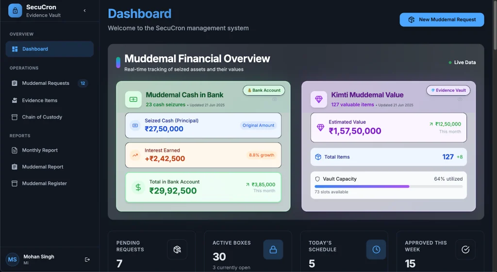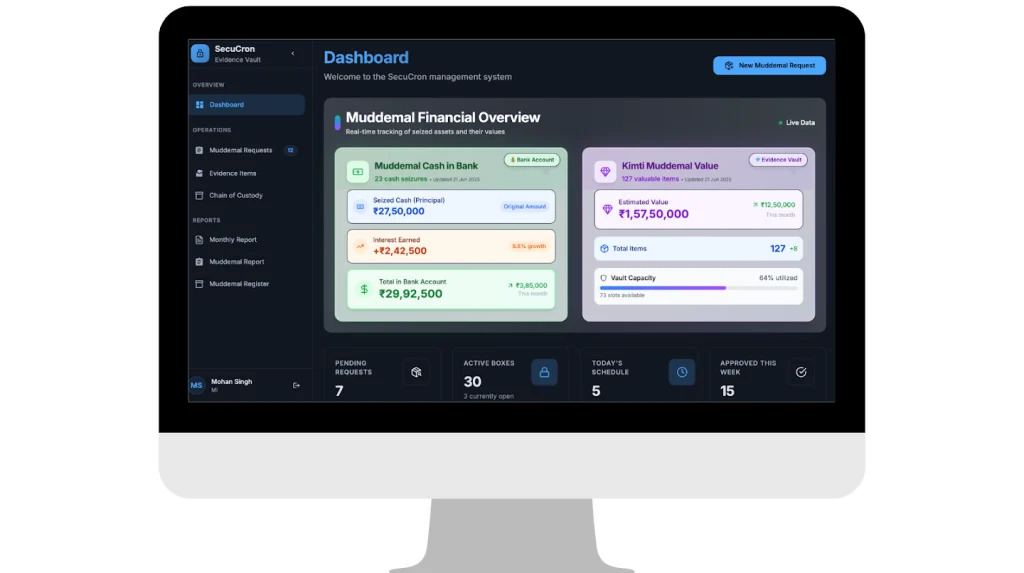 उच्च-मूल्याचे मुद्देमाल IoT-सक्षम सुरक्षित संचय कक्ष मध्ये सुरक्षित ठेवले जाते, जिथे प्रवेश नियंत्रित असतो. ही छेडछाड-प्रतिरोधक संग्रहण प्रणाली उच्चतम पातळीची सुरक्षा सुनिश्चित करते. भूमिका-आधारित प्रवेश नियंत्रण जबाबदारी अधिक मजबूत करते, ज्यामुळे फक्त अधिकृत अधिकारीच वॉल्ट्स चालवू शकतात.