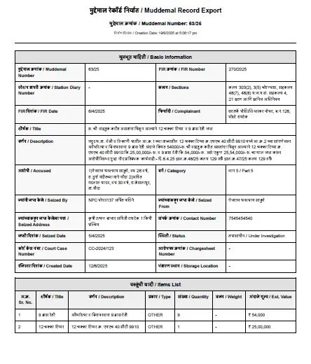 प्रत्येक जप्त केलेली वस्तू आणि संचय बॉक्सला अद्वितीय QR कोड दिला जातो, ज्यामुळे त्वरीत ओळख, अचूक ट्रॅसिंग आणि जलद पुनर्प्राप्ती शक्य होते. यामुळे पुरावे न्यायालयात विलंब न करता सापडतात आणि सादर करता येतात.